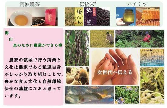 稲作や阿波晩茶、養蜂等の私達の取り組みは、山から里、水系でつながる食文化と自然環境保全、食糧生産基盤の維持存続のためです。