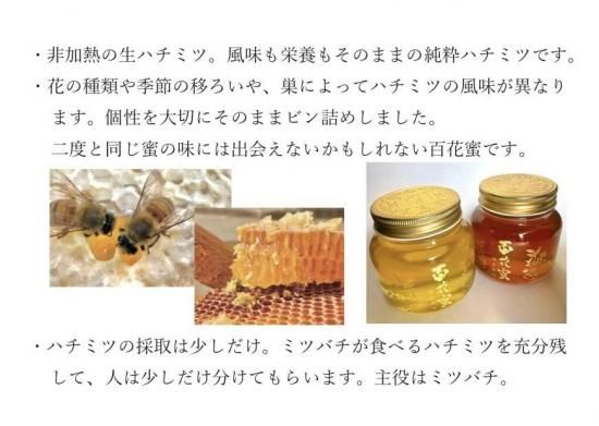 ・花の種類や季節の移ろいや、巣によってハチミツの風味が異なります。個性を大切にそのままビン詰めしました。巣ごとに季節ごとに変わるハチミツを、混ぜずにそのまま瓶詰めしたので、まさに一期一会の百花蜜になりました。